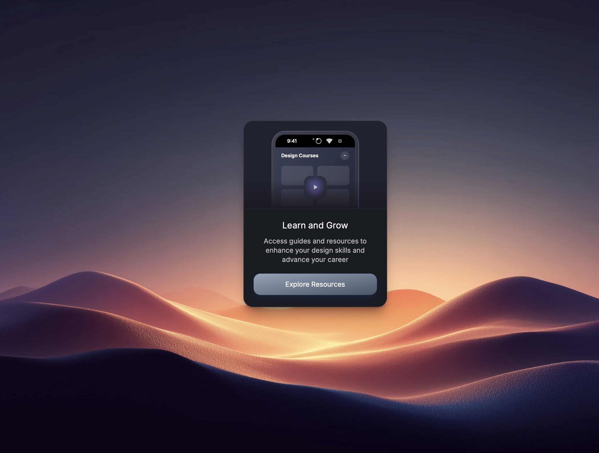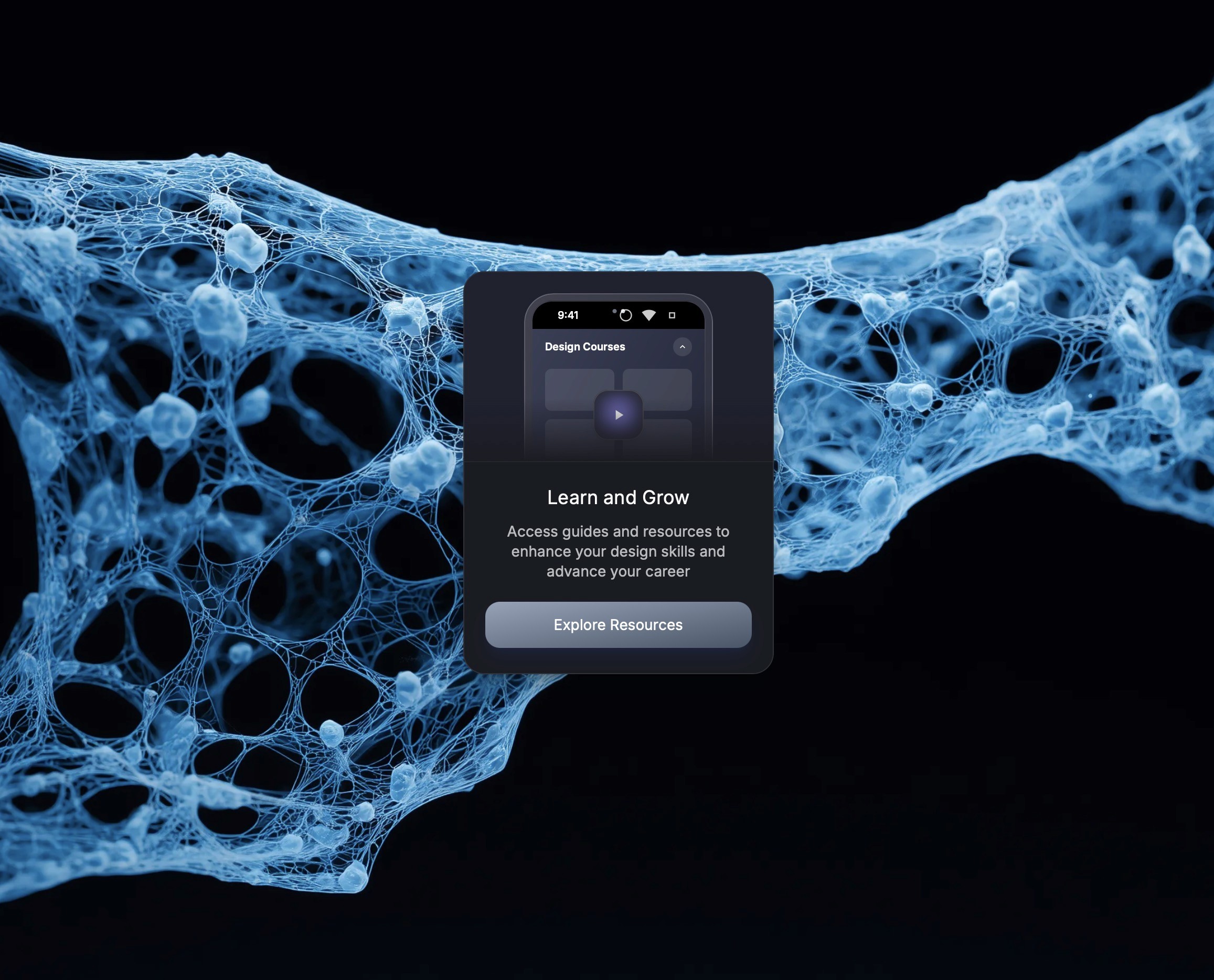 This client project features a refined promotional visual for a design-education platform, crafted to highlight the “Learn and Grow” resource hub. At the center, a polished glass-morphism card displays a mobile interface mockup paired with concise messaging that encourages skill development and career advancement. The button element is styled for clarity and high contrast, ensuring clear user engagement.